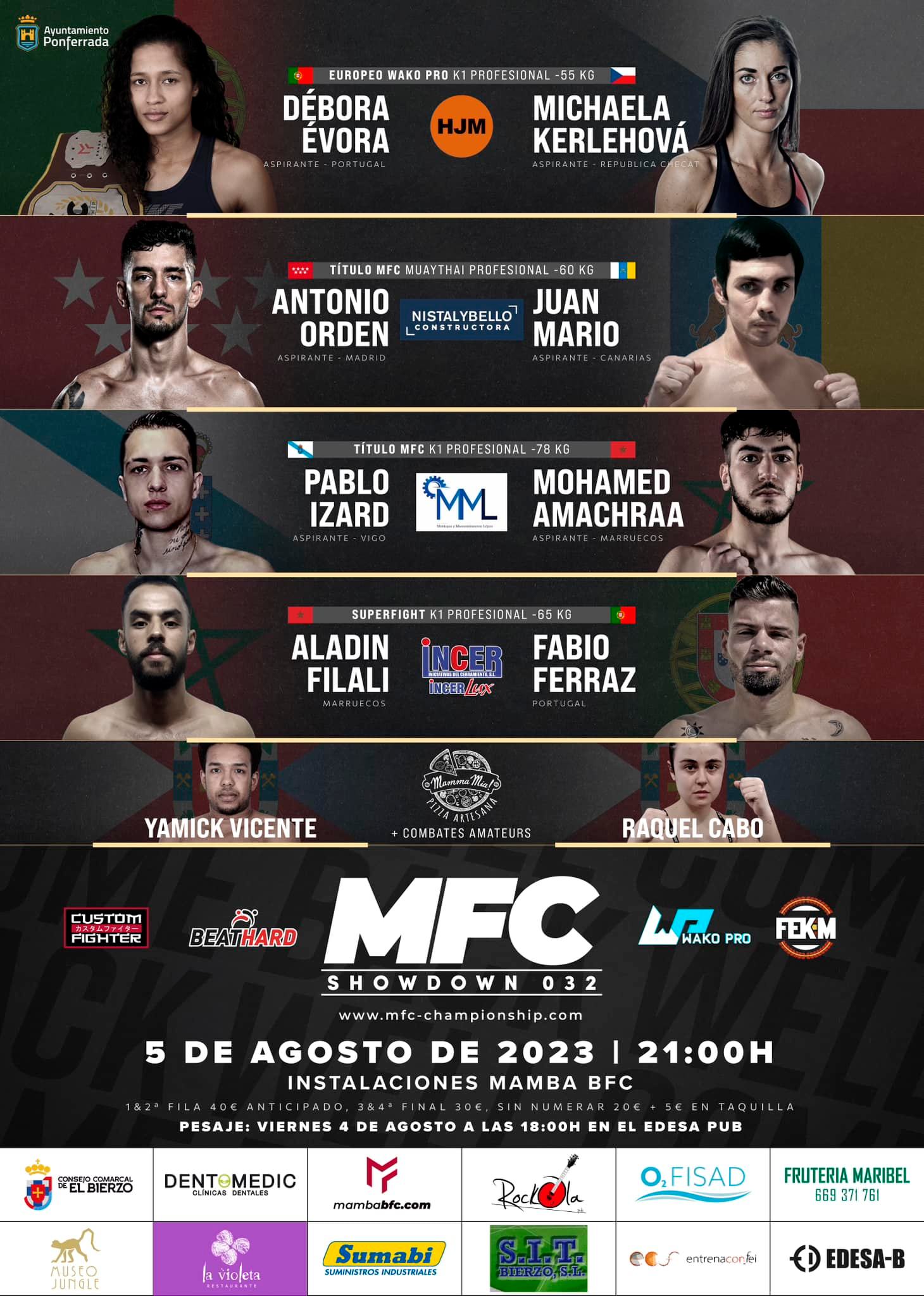 El cartel principal está compuesto por los combates de Aladin Filali contra Fabio Ferraz en K1 (kick boxing) -65Kg, la pelea por el título privado MFC entre Pablo Izard y Mohamed Amachraa en K1 -75Kg y los encuentros estelar y coestelar donde podremos ver a Débora Évora contra Michaela Kerlehová por el título europeo Wako Pro en K1 -55Kg y a Antonio Orden contra Juan Mario en Muay Thai -60Kg respectivamente.