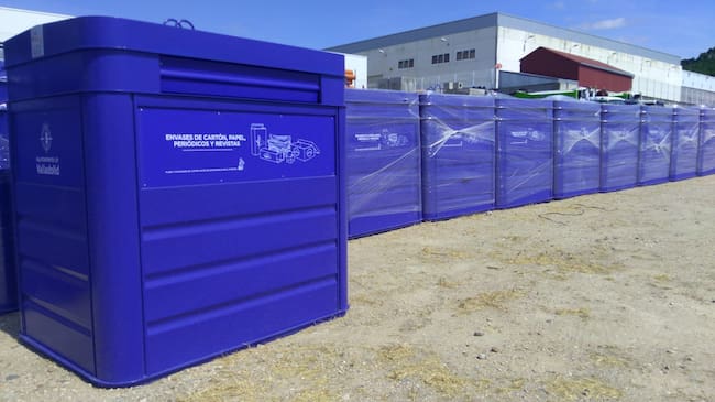 Contenedores azules para papel y cartón en Valladolid, un modelo que se irá sustituyendo por otros de carga lateral / Ayuntamiento de Valladolid