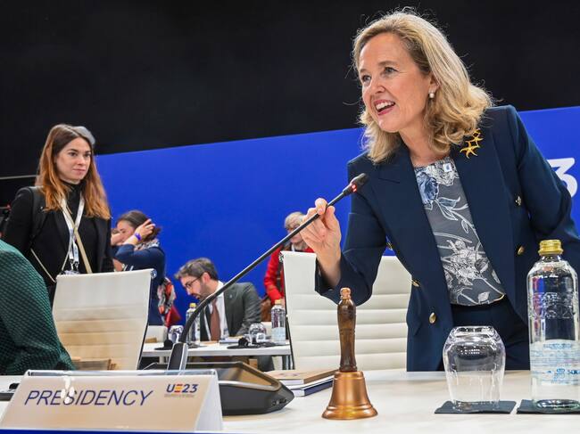 LEÓN, 23/10/2023.- La vicepresidenta primera y ministra de Asuntos Económicos y Transformación Digital en funciones, Nadia Calviño, preside la reunión informal ministerial de Telecomunicaciones, este lunes en el Palacio de Congresos de León. EFE/ Pool Peue/J.Casares SÓLO USO EDITORIAL / SÓLO DISPONIBLE PARA ILUSTRAR LA NOTICIA QUE ACOMPAÑA (CRÉDITO OBLIGATORIO) / Pool PEUE/J. Casares (EFE)