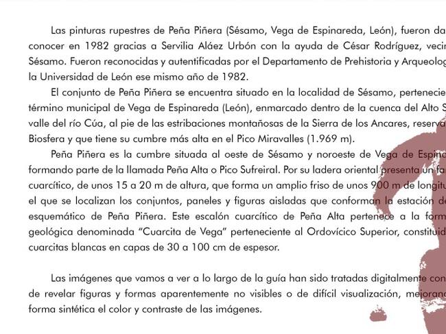 Aparecen de nuevo vandalizadas las pinturas rupestres de Peña Piñera, en Sésamo, municipio de Vega de Espinareda. La asociación cultural Tierra Cultura y Arte se ha encontrado este fin de semana con que alguien ha rayado la pintura más conocida del conjunto rupestre, la representación antropomórfica que aparece en todas las guías de referencia sobre el conjunto prehistórico. Sobre la figura humana se han trazado dibujos rayados sobre la piedra que dificultan la visión de la pintura original, para asombro de los excursionistas de esta asociación que acudieron el fin de semana a visitarlas, entre ellos una profesora norteamericana que había participado en los talleres de pintura Cyan de Fabero, según explicaba el profesor universitario de la ULE, colaborador de la Asociación, Enrique Javier Díez, quien además considera que estos elementos deberían estar más protegidos, mediante la colocación de algún tipo de mampara que impida el acceso.