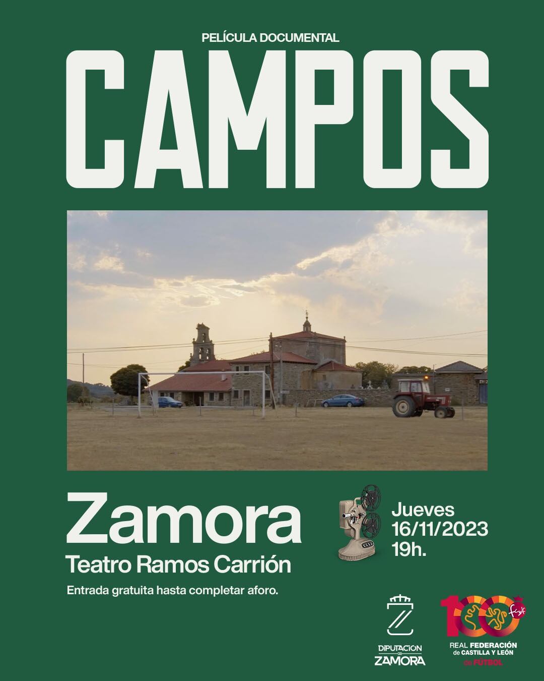 La película documental “Campos” aborda el tema de la despoblación de las zonas rurales de Castilla y León, teniendo como hilo conductor escenarios de campos de fútbol en desuso. Lanza una mirada diferente a ese deporte y fenómeno social que tantas pasiones desata, reflejando situaciones que suceden en torno a esos espacios donde un día se jugaba al fútbol y hoy, por razones sociodemográficas varias, ya no sucede así. Rescata del olvido y enmarca una realidad sociocultural que ha tenido gran presencia e importancia en los pueblos: el fútbol como elemento de cohesión social y generador de relaciones humanas, con esencias diferentes a las que adquiere el fútbol profesional y el enorme negocio que rodea a aquel. “Campos” refleja la constatación de que ese deporte que mueve a millones y de personas, en muchos pueblos desaparece. Todo ello prestando especial atención a su vez a las ubicaciones de los terrenos de juego futbolístico como símbolo y elemento arquitectónico dentro de diferentes paisajes rurales de Castilla y León, una región tan extensa que hace que la variedad de sus geografías sea muy rica.