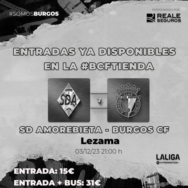 La SD Amorebieta pone a disposición del Burgos CF entradas en grada visitante para el encuentro programado para el domingo 3 de diciembre a partir de las 21:00 horas. Los tickets, que se venderán a un precio de 15 euros y se podrán comprar en la BCF Tienda hasta el viernes 1 de diciembre a las 14:00 horas.