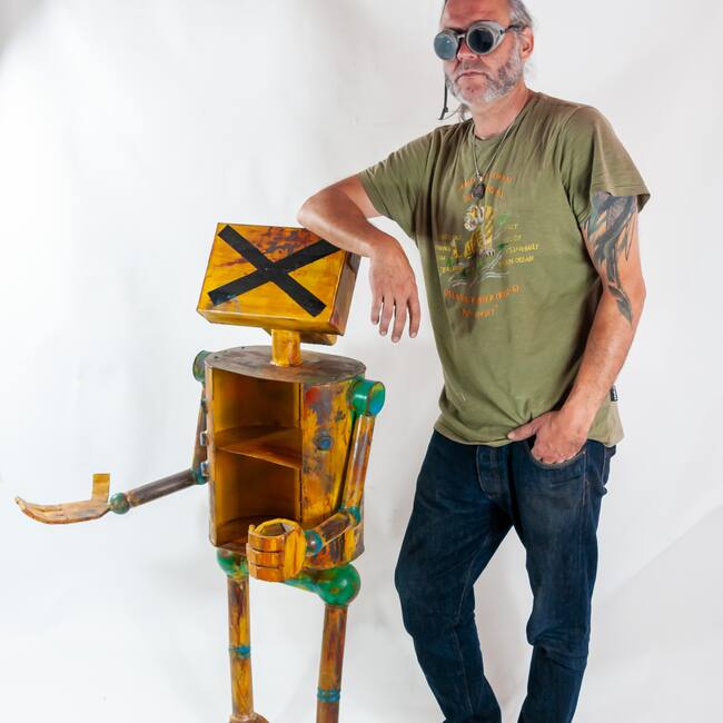El extraordinario cartel musical que da forma a esta nueva edición del INVERFEST, en el que destacan nombres como 21, Ariel Rot, Iván Ferreriro, Valeria Castro, Salvador Sobral, Ismael Serrano, Morgan, Rodrigo Cuevas, Belako, Sole Giménez o Izaro, es lo que ha inspirado a José Castrillo, cuyos robots representan una banda de rock, cuatro de ellos de un metro y medio de altura y dos más pequeños, pero también “más salvajes y musicales”. Eso sí, en todos ellos destaca la autenticidad y ese modo de producción manual y artesanal “marca de la casa” que diferencia la obra de este artista del hierro natural de Guardo y cuyo taller se encuentra en la pequeña localidad de Tarilonte de la Peña, en plena Montaña Palentina.