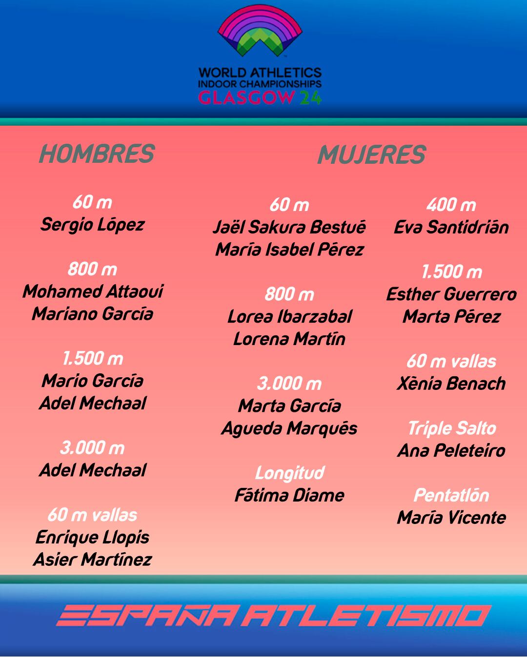 Después de cerrarse el sistema World Ranking este jueves 22 de febrero, los nueve atletas españoles que estaban pendientes de su clasificación han sido admitidos por World Athletics, por lo que han sido preseleccionados para representar a la selección española en el Campeonato del Mundo Absoluto en pista cubierta que se disputará en Glasgow del 1 al 3 de marzo.
