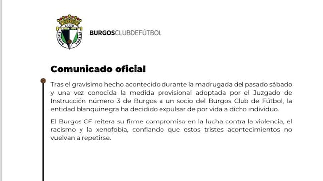 "Tras el gravísimo hecho acontecido durante la madrugada del pasado sábado y una vez conocida la medida provisional adoptada por el Juzgado de Instrucción número 3 de Burgos a un socio del Burgos Club de Fútbol, la entidad blanquinegra ha decidido expulsar de por vida a dicho individuo. El Burgos CF reitera su firme compromiso en la lucha contra la violencia, el racismo y la xenofobia, confiando que estos tristes acontecimientos no vuelvan a repetirse".