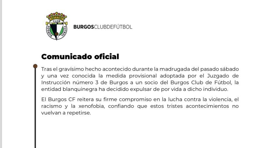 "Tras el gravísimo hecho acontecido durante la madrugada del pasado sábado y una vez conocida la medida provisional adoptada por el Juzgado de Instrucción número 3 de Burgos a un socio del Burgos Club de Fútbol, la entidad blanquinegra ha decidido expulsar de por vida a dicho individuo. El Burgos CF reitera su firme compromiso en la lucha contra la violencia, el racismo y la xenofobia, confiando que estos tristes acontecimientos no vuelvan a repetirse".