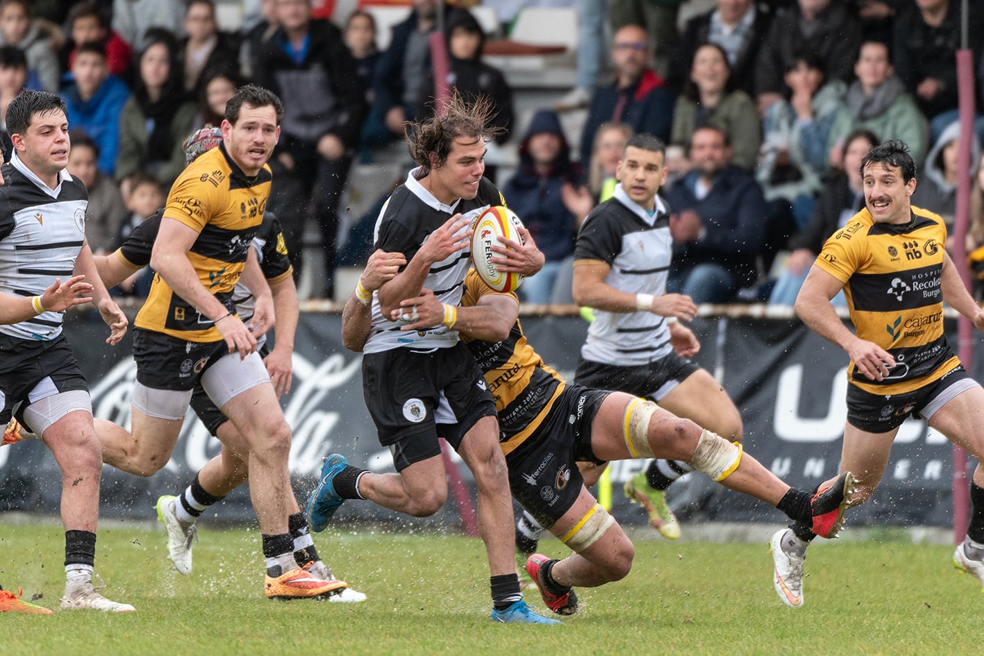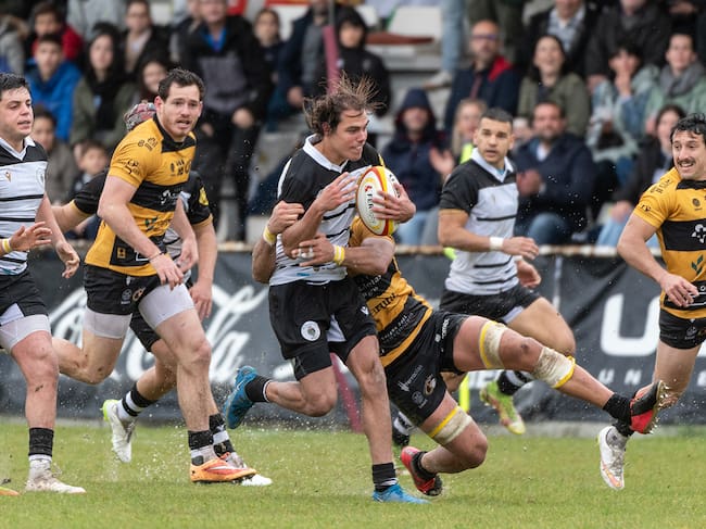 La clave del partido estuvo nada mas salir cuando el árbitro concedió un ensayo de castigo al Burgos y además mostró amarilla a Fernando Romanos lo que dejó a los locales con uno menos 10 minutos y eso en rugby es mucho, tanto que los biurgaleses pusieron tierra de por medio con un segundo ensayo cuando sólo se llevaban seis minutos segunda mitad.