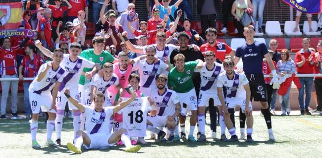 Los jugadores del Numancia celebran el triunfo en Cobeña ante su afición. / CD Numancia