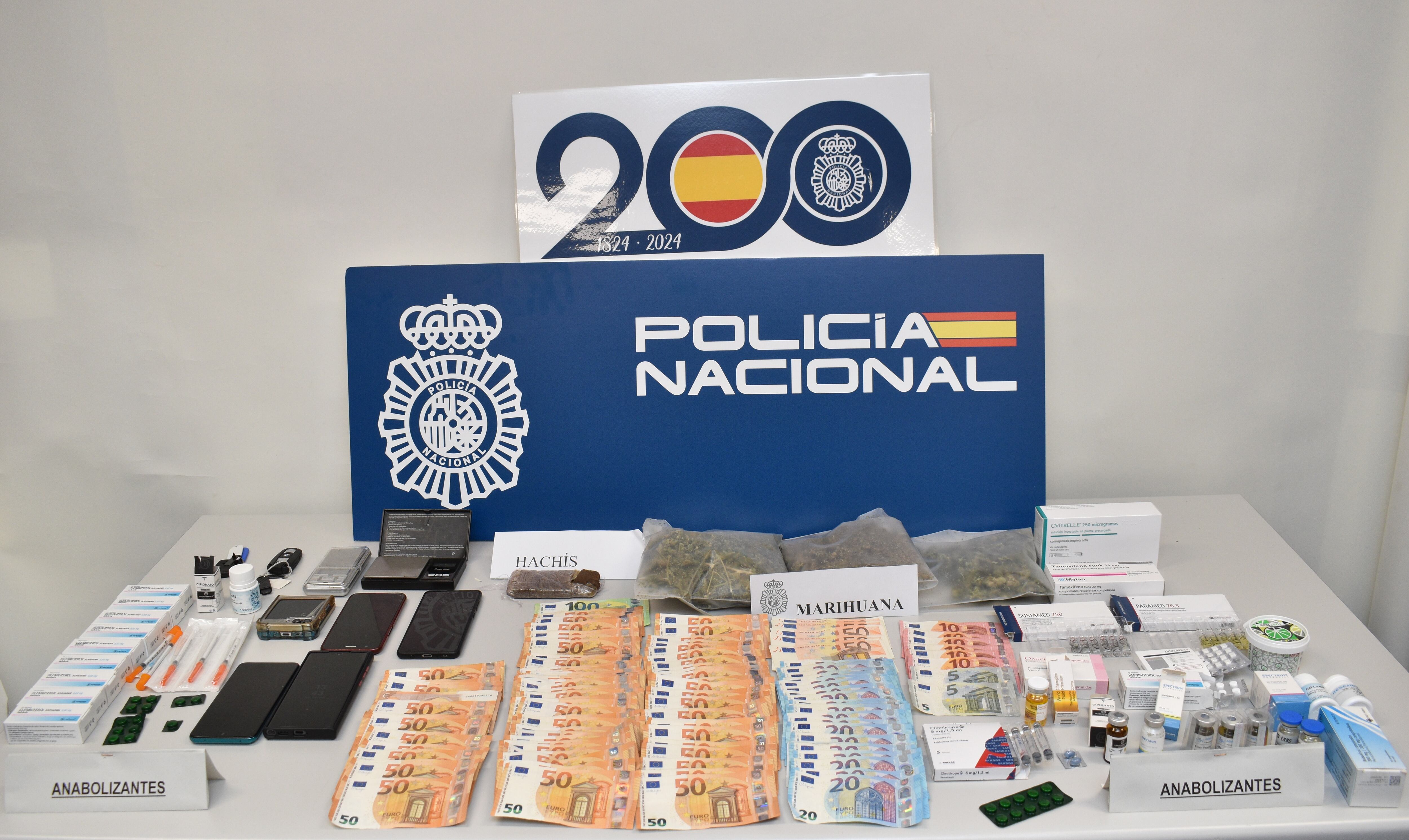 En los dos registros practicados se encontraron 100 gramos de hachís, 230 gramos de marihuana, material para la elaboración de monodosis, dos básculas de precisión, más de 4.000 euros en efectivo, más de 2000 dosis de medicamentos de distintos tipos de las conocidas anabolizantes esteroides, dos vehículos uno de ellos de alta gama y seis dispositivos electrónicos.