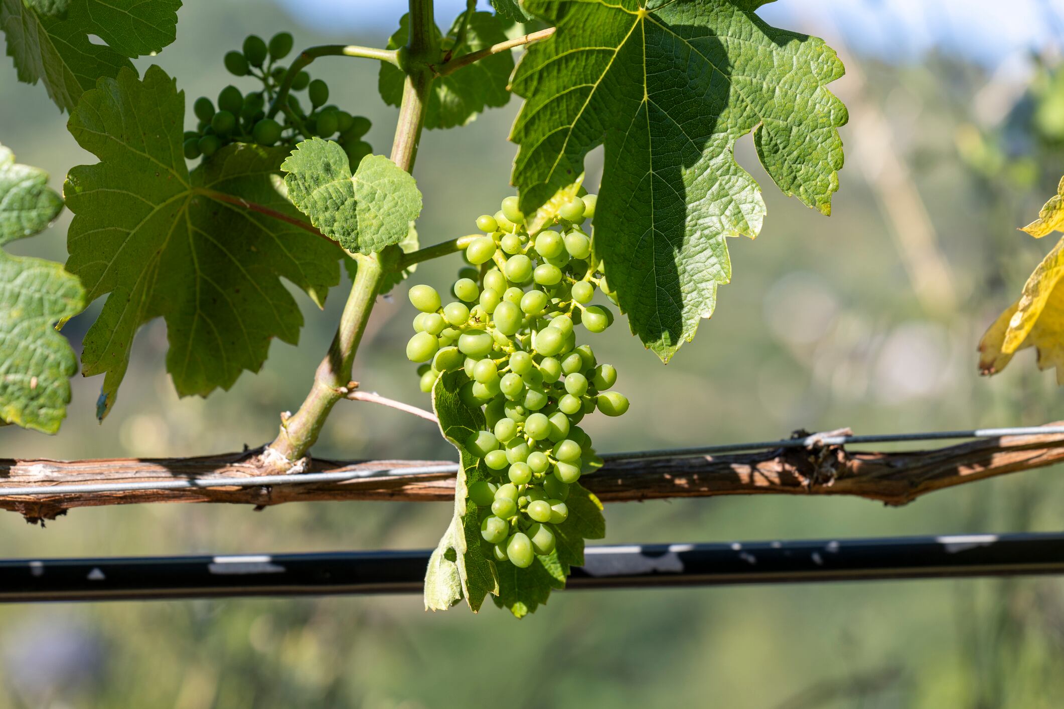 A close-up image of green grapes "Godello" clustered together, hanging from a vine. It's illuminated by sunlight, showcasing their freshness and readiness for harvest in a natural environment. / Benito Juncal