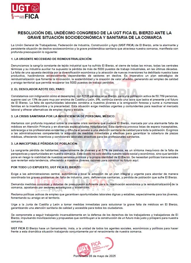 El Congreso ha aprobado además una resolución en la que se insta a la unidad de los agentes sociales, económicos, políticos y de trabajadores impulsando movilizaciones y propuestas que contribuyan a la construcción de un futuro más justo y próspero para la comarca.