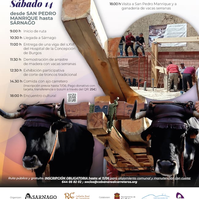 La jornada, organizada por la Asociación de Amigos de Sarnago y la Cabaña Real de Carreteros, comenzará a las 9:00 h en San Pedro Manrique, desde donde partirá la carreta cargada con la histórica viga, arrastrada por vacas serranas, raza autóctona de las montañas sorianas. Tras recorrer antiguos caminos de trashumancia y monte, la comitiva llegará a Sarnago a las 10:30 h, donde se celebrará un acto de bienvenida y entrega simbólica de la viga.