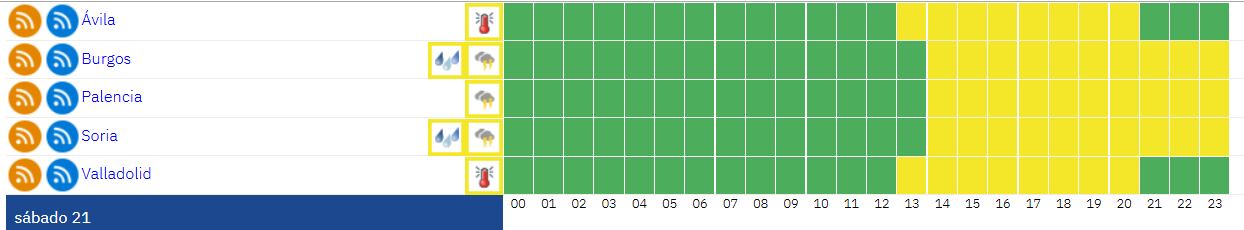 A su vez, también habrá avisos por calor en Sierra de Madrid, Metropolitana y Henares y Sur, Vegas y Oeste (Comunidad de Madrid); Vega del Segura (Región de Murcia); Centro de Navarra, Pirineo navarro y Ribera del Ebro de Navarra (Comunidad Foral de Navarra); Ribera del Ebro de La Rioja (La Rioja); Alicante y Valencia (Comunidad Valenciana).