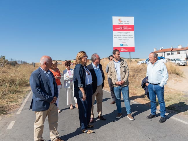 El delegado de la Junta de Castilla y León en Palencia, José Antonio Rubio, acompañado por el alcalde de Dueñas, Miguel Ángel Blanco, y la presidenta de la Diputación Provincial de Palencia, Ángeles Armisén, han visitado la carretera provincial PP-9031 para conocer de primera mano las obras llevadas a cabo en este eje que conecta el núcleo urbano de Dueñas con el límite de la provincia de Valladolid a lo largo de 7,507 kilómetros.
