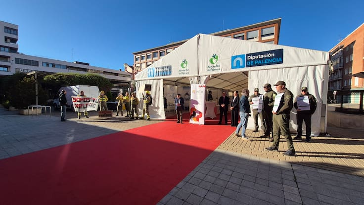Profesionales de la extinción de incendios se manifiestan a la llegada de Suárez Quiñones a Palencia