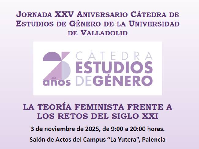 El próximo lunes 3 de noviembre la Facultad de Educación de Palencia celebrará, en el Salón de Actos del Campus La Yutera, desde las 9:00 hasta las 20,00 horas, la Jornada XXV Aniversario de la Cátedra de Estudios de Género de la Universidad de Valladolid. La teoría feminista frente a los retos del siglo XXI, coordinada por el profesor Iván Sambade Baquerín y la profesora Fátima Cruz Souza.