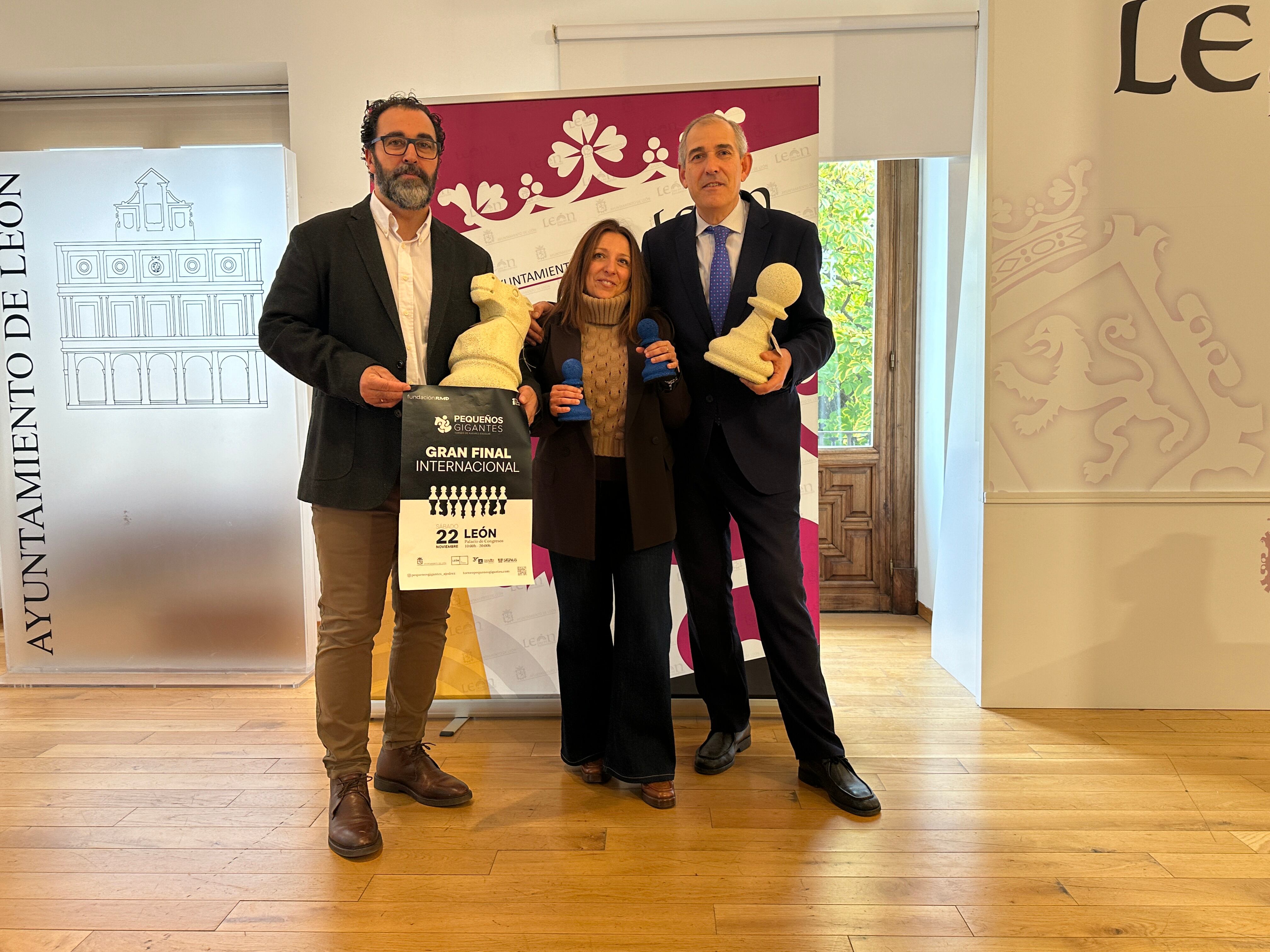La ciudad de León se volcará este sábado 22 de noviembre con la celebración de la gran final del Torneo de Ajedrez Escolar Pequeños Gigantes que regresa un año más al Palacio de Exposiciones y que contará con la participación de 64 equipos, siete pertenecientes a colegios leoneses. Esta mañana, el concejal de Deportes del Ayuntamiento de León, Vicente Canuria, ha presentado esta cita acompañado de Nicolás González, director Comercial de Fundación RMD; y de la gerente de Aguas de León, María Pilar Lasheras.