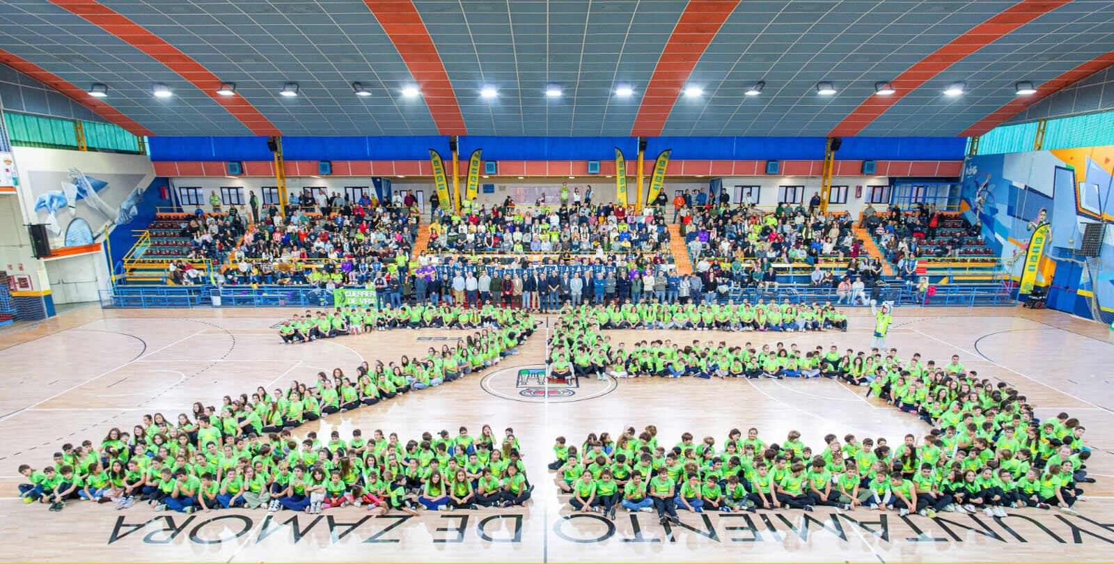 El Balonmano Zamora vivió una jornada festiva con la foto de familia donde más de 600 jugadores de la cantera y la escuela del club pistacho formaron la figura de un 25, los años desde la refundación del club.