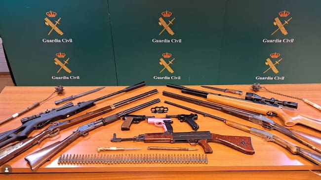 Los hechos tuvieron lugar durante la mañana de este lunes 19 de enero, cuando se efectuó una entrada y registro en el domicilio del detenido, donde se localizaron cinco armas de fuego (dos escopetas, dos rifles y una avancarga), cinco armas de aire comprimido (dos carabinas y tres pistolas de airsoft), seis armas prohibidas (dos rompecabezas, una llave pugilato, dos bayonetas y un bastón estoque) y 442 cartuchos de hasta 16 calibres diferentes, incluyendo algunos de guerra.