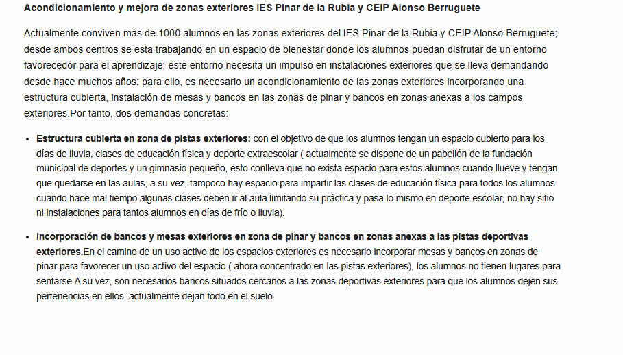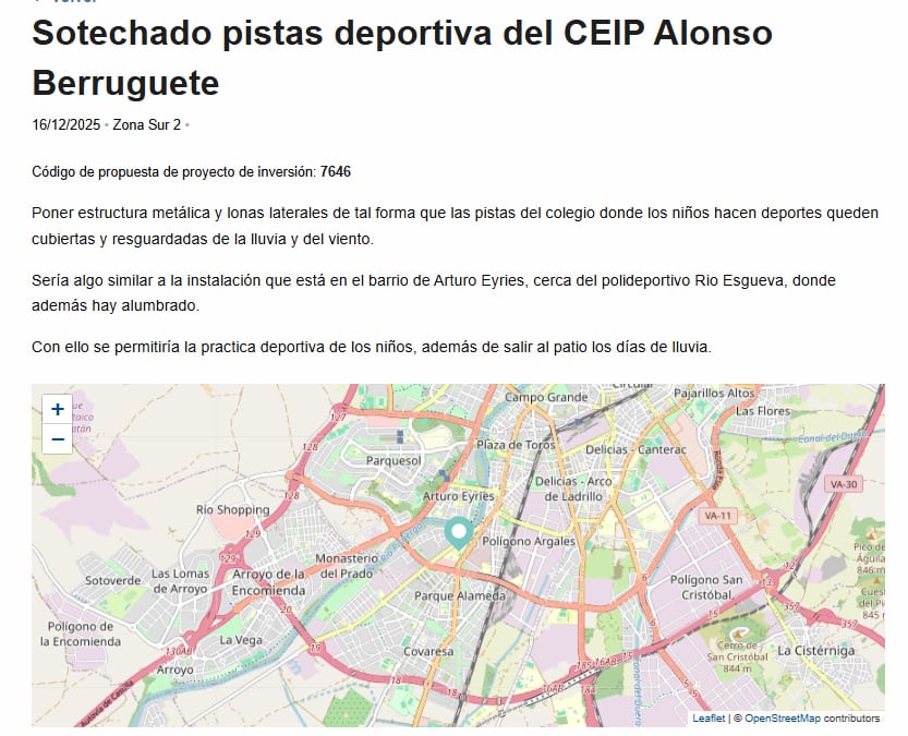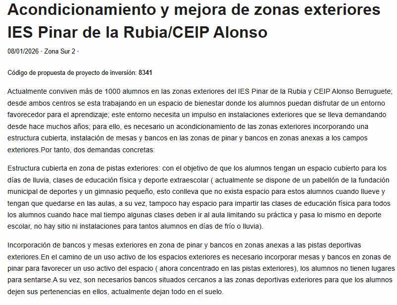 A esto se suma que luego hay otros proyectos, como decíamos, que aparecen repetidos. Por poner otro ejemplo: en la Zona Sur dos, que es la que engloba los barrios de Parque Alameda, Covaresa, el Peral o Camino Viejo de Simancas aparecen tres proyectos para pedir que se mejoren las zonas exteriores del Instituto El Pinar de la Rubia y El Colegio Alonso Berruguete. Dos de ellas tienen el mismo título, una ya tiene 54 votos, la otra 83 y piden lo mismo. Además, hay otra tercera con un título diferente pero que en esencia comparte la petición principal de estas dos que es un sotechado para el polideportivo. Ésta tiene 60 votos.