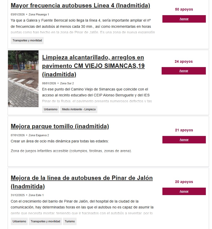 Un ejemplo. Ahora mismo, hay un proyecto, el de pedir mayor frecuencia de los autobuses de la línea 4 que pone inadmitido pero que se puede votar, de hecho, reúne ya 50 votos. Otro ejemplo, limpieza del alcantarillado del Camino Viejo de Simancas y pone también que es un proyecto inadmitido pero tiene 24 votos. Es decir, que aparecen proyectos que a priori, no deberían aparecer según denuncia la presidenta de la Federación de Vecinos Antonio Machado, Margarita García.