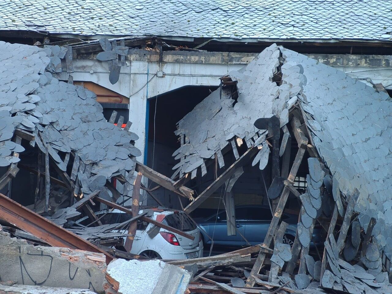Un garaje propiedad de Martínez Núñez frente a la Iglesia de San Ignacio se ha venido abajo. El derrumbe del tejado y la pared de la nave, ubicada en la calle Castro, se han caído hacia la confluencia con la calle embalse de Bárcena. Hay seis coches afectados, cuatro que estaban en el interior y dos que están aparcados fuera. Los bomberos y la policía trabajan a esta hora en la retirada de los automóviles.