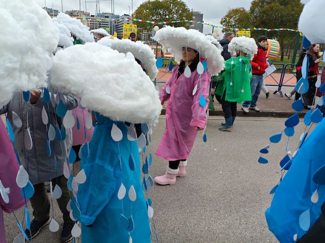 En el colegio de Columbrianos, la AMPA invitaba a bailar bajo la lluvia y los integrantes de la comitiva aprovechaban para recordar que necesitan una cubierta para el patio y así poder bailar sin mojarse