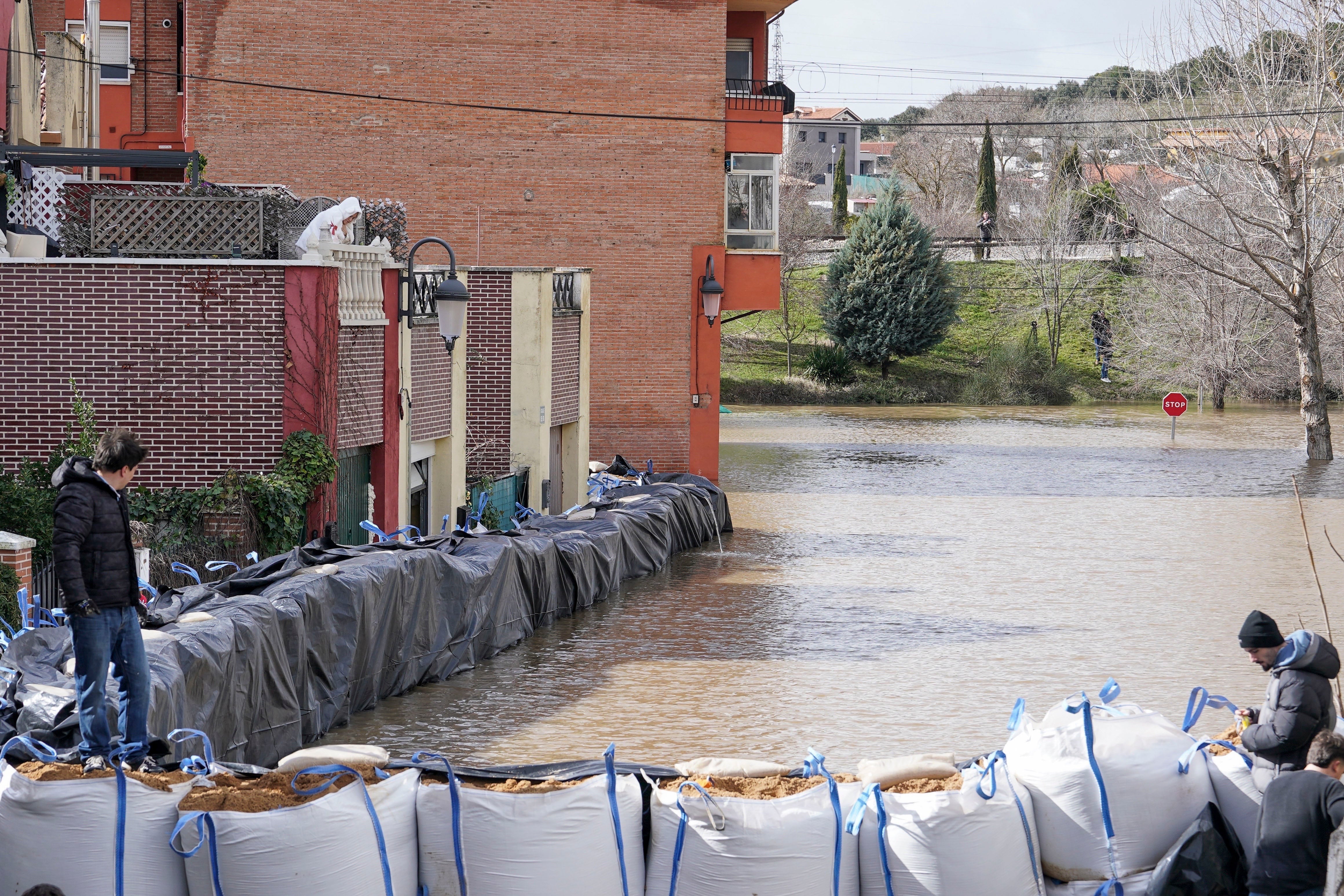 FOTODELDÍA VIANA DE CEGA (VALLADOLID), 12/02/2026.- Vecinos de la localidad vallisoletana de Viana de Cega observan el desbordamiento del rio Cega este mediodía, debido a la crecida del mismo por las intensas lluvias de este mes. El río, a raíz del deshielo y las lluvias de las últimas semanas, se ha desbordado de forma leve según lo esperado por los vecinos al menos desde hace dos días, hasta el punto de que el Ayuntamiento había instalado grandes sacas de arena en la orilla y en el acceso a una de las calles situadas junto al puente del ferrocarril. EFE/ Nacho Gallego / NACHO GALLEGO