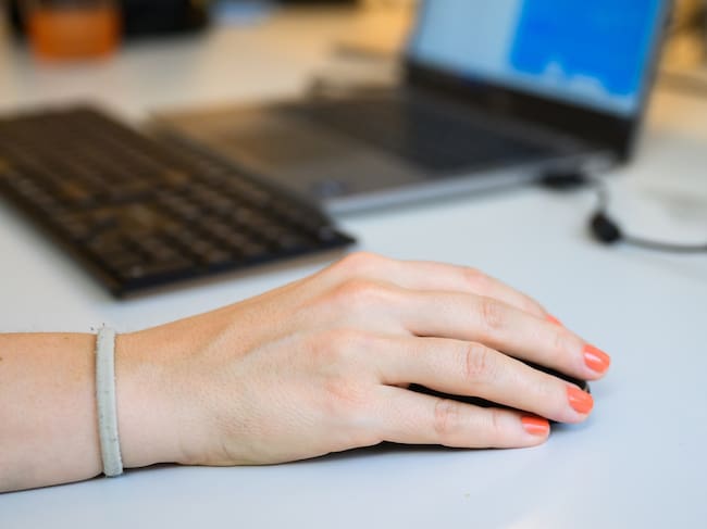 Mano de una mujer sobre el ratón de un ordenador.