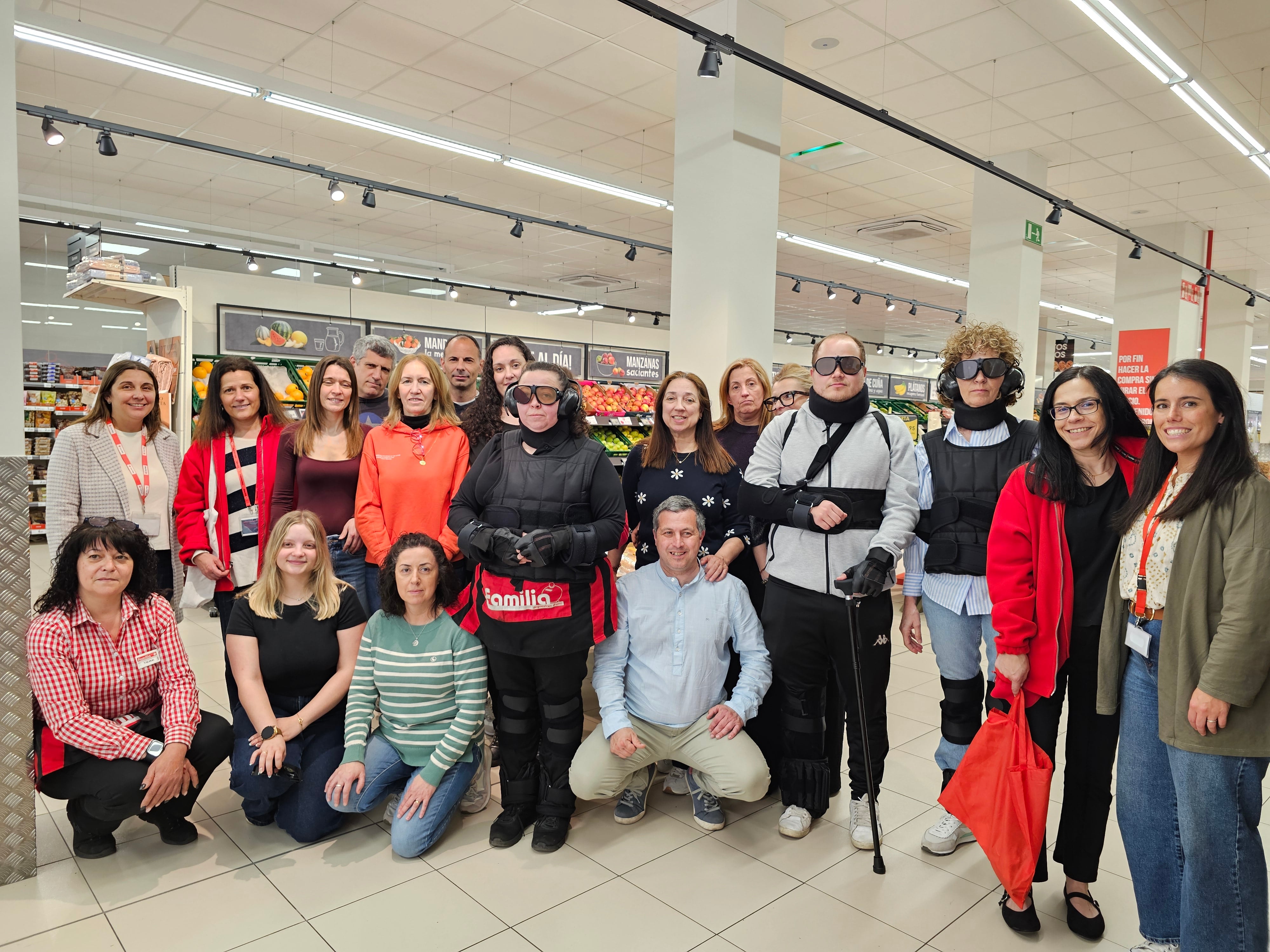 En los talleres formativos, los equipos de tienda participantes tienen la oportunidad de ponerse en la piel de personas mayores a través de un traje adaptado, facilitado por Cruz Roja, para experimentar las principales patologías asociadas al proceso de envejecimiento, como son la pérdida de movilidad y disminución de agudeza sensorial, e incluso otras más específicas como la hemiparesia o la EPOC, entre otras. Con el traje puesto, pueden realizar una compra completa, visitando distintas secciones como panadería, pescadería o frutería y comprobar como estas patologías influyen en una actividad tan común como es la visita a un supermercado.