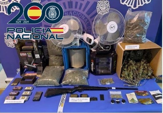 Los agentes intervinieron numerosas plantas en distintos estados de crecimiento —algunas ya cortadas y en proceso de secado—, dos centrifugadoras de polen, ventiladores, lámparas LED, calefactores eléctricos, semilleros, fertilizantes, termostatos, una sulfatadora, así como tabletas de hachís y diversos recipientes con sustancia vegetal estupefaciente.