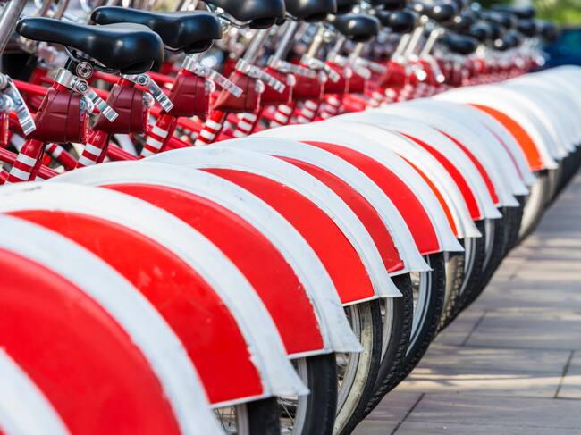 A row of rental bikes in their docking stands in downtown Barcelona, Catalonia, Spain / Jordi de Rueda