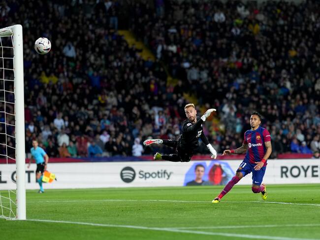BARCELONA, SPAIN - MARCH 30: Raphinha of FC Barcelona scores his team's first goal past Aaron Escandell of UD Las Palmas during the LaLiga EA Sports match between FC Barcelona and UD Las Palmas at Estadi Olimpic Lluis Companys on March 30, 2024 in Barcelona, Spain. (Photo by Alex Caparros/Getty Images) / Alex Caparros