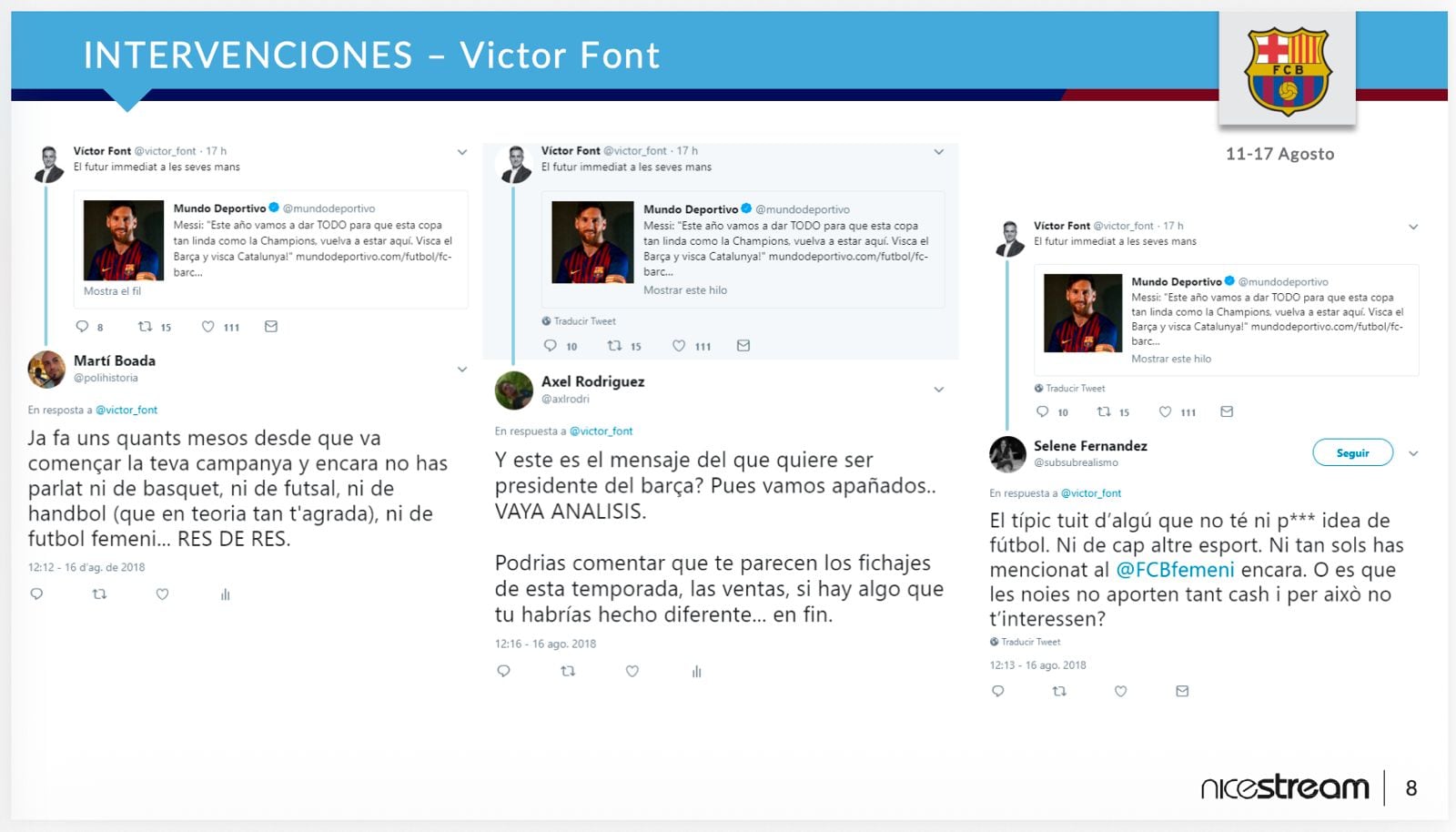 La policia catalana ratifica que l'expresident rebia informes d'intervencions a xarxes contra exdirectius com Joan Laporta, Elena Fort, el candidat Víctor Font, opinadors i periodistes. En diverses ocasions, va demanar que s'intervingués per modificar l'opinió pública sobre diverses qüestions d'actualitat