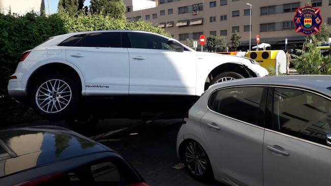Los hechos ocurrieron en la mañana de este jueves, en un parking al aire libre situado en la calle Pablo Picasso, cuando por causas que se están investigando, un vehículo, un Audi Q3 blanco, perdió el control y, tras chocar con un árbol, acabó subido a otro coche que estaba aparcado y a la acera.