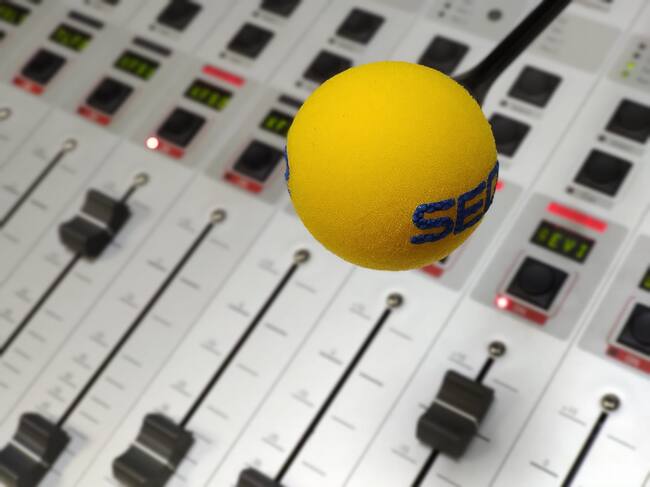 Un micrófono de Cadena SER en primer plano, y una mesa de mezclas al fondo / Jose Gómez Garrido