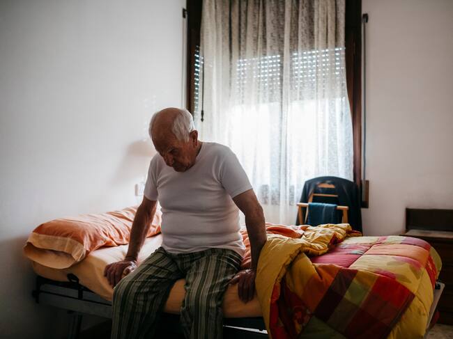Un anciano, sentado al borde de su cama / JOSEP M ROVIROSA