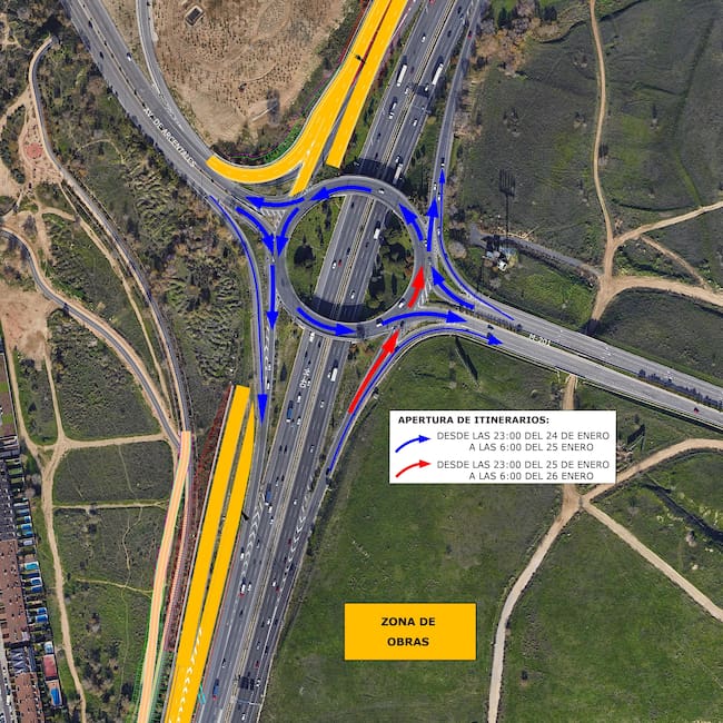 Esta glorieta, que une la avenida de Arcentales con la carretera M-201 (San Blas - Coslada), reabrirá el tráfico en dos fases: el jueves 25 de enero, se permitirá el acceso a la glorieta desde la M-40 Sur únicamente para dirigirse a la M-201 dirección Coslada, y desde la M-201 para acceder a la M-40 en ambos sentidos. El viernes 26, estas posibilidades se mantienen, y se añade el acceso a la glorieta desde la M-40 Sur para dirigirse a la avenida de Arcentales.