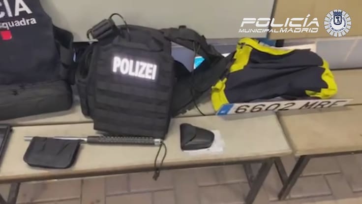 Al registrar el vehículo, los agentes encontraron unos grilletes, un chaleco antibalas de los “MOSSOS DE ESQUADRA”, otro chaleco simulado con un parche con la palabra “POLIZEI”, una defensa extensible catalogada como arma prohibida, y dos placas de matrícula sustraídas.