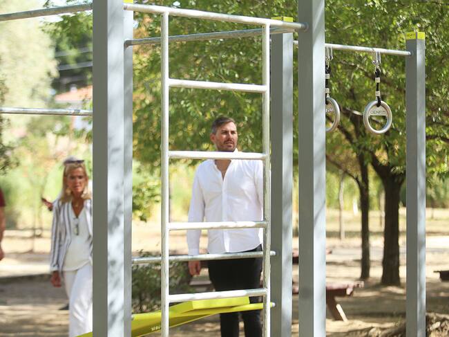 La alcaldesa de Collado Villalba, Mariola Vargas, y el concejal de Medio Ambiente, Adan Martínez, junto a las nuevas áreas de calistenia del Parque Romacalderas,