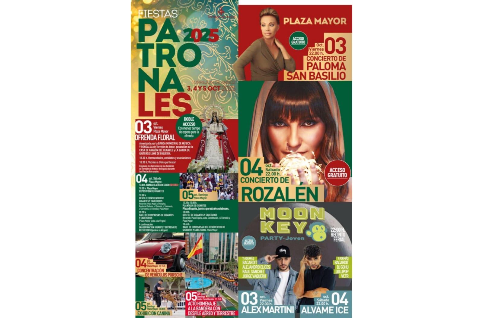 Torrejón de Ardoz presenta la programación de sus Fiestas Patronales, que se celebrarán del 3 al 5 de octubre. Encabezan el cartel los conciertos gratuitos de Rozalén y Paloma San Basilio. Asimismo, la ciudad acogerá a los DJ's Alex Martini y Alvama Ice, la tradicional Ofrenda Floral, el Homenaje a la Bandera y el Encuentro de Gigantes y Cabezudos.
