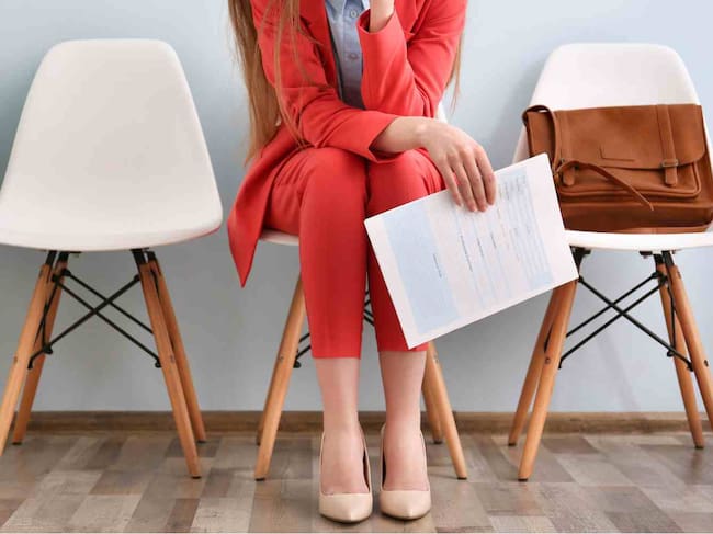 Imagen de una mujer con un currículum en la mano, sentada