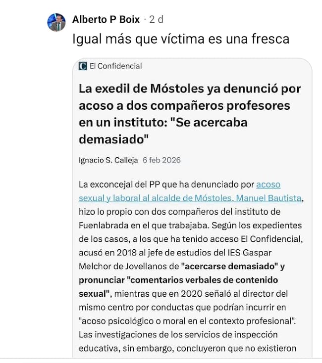 El entorno del alcalde de Móstoles, Manuel Bautista, continúa con su operación de acoso y derribo a la exconcejala que le denunció internamente por presunto acoso sexual y laboral, tratanto de desacreditarla personalmente. Alberto Pérez Boix, que es coordinador de Recursos Humanos, Hacienda y Presidencia del Ayuntamiento de Móstoles, cargo de confianza del Partido Popular y una de las personas próximas al alcalde Manuel Bautista, ha iniciado en redes sociales una ofensiva directa contra la exconcejala.