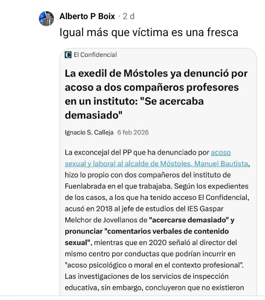 El entorno del alcalde de Móstoles, Manuel Bautista, continúa con su operación de acoso y derribo a la exconcejala que le denunció internamente por presunto acoso sexual y laboral, tratanto de desacreditarla personalmente. Alberto Pérez Boix, que es coordinador de Recursos Humanos, Hacienda y Presidencia del Ayuntamiento de Móstoles, cargo de confianza del Partido Popular y una de las personas próximas al alcalde Manuel Bautista, ha iniciado en redes sociales una ofensiva directa contra la exconcejala.