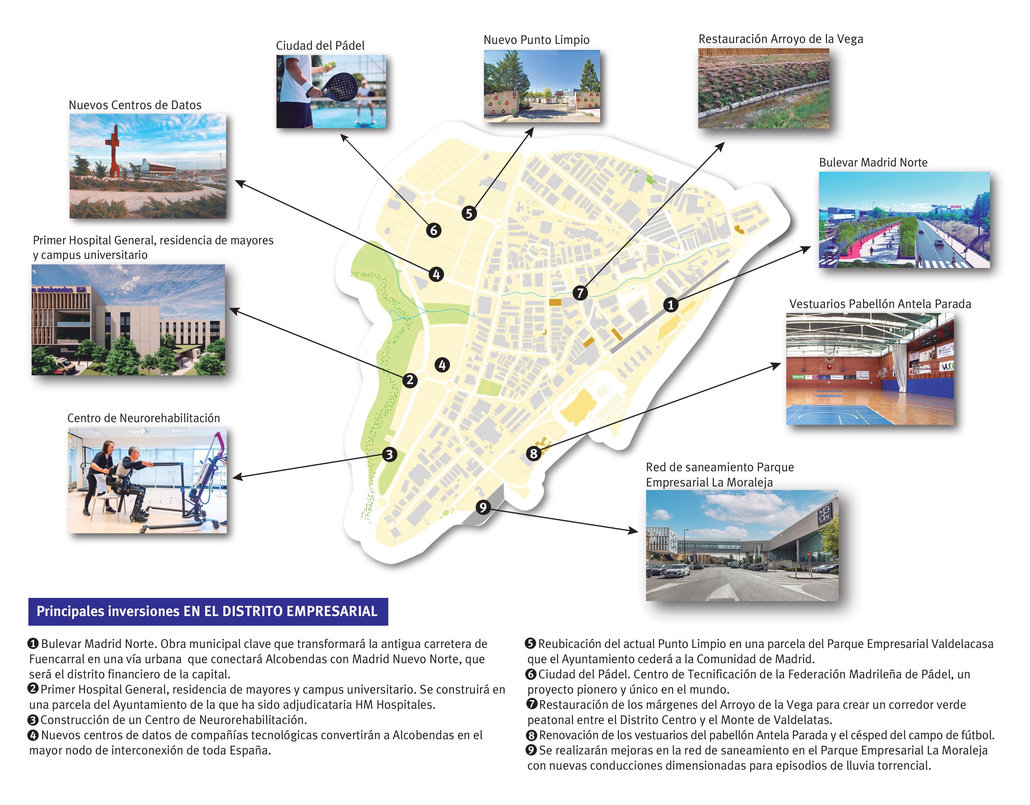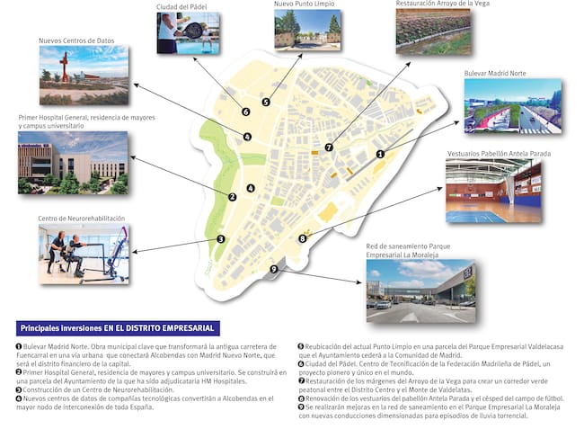 En el Distrito Empresarial, se desarrollará el gran proyecto del Bulevar Madrid Norte que transformará la antigua carretera de Fuencarral, el hospital y residencia privados que se desarrollará en una parcela municipal, los nuevos centros de datos proyectados, la reubicación del Punto Limpio, la restauración de los márgenes del Arroyo de la Vega, la renovación de los vestuarios del pabellón Antela Parada y el césped del campo de fútbol, o la renovación en la red de saneamiento del Parque Empresarial La Moraleja.