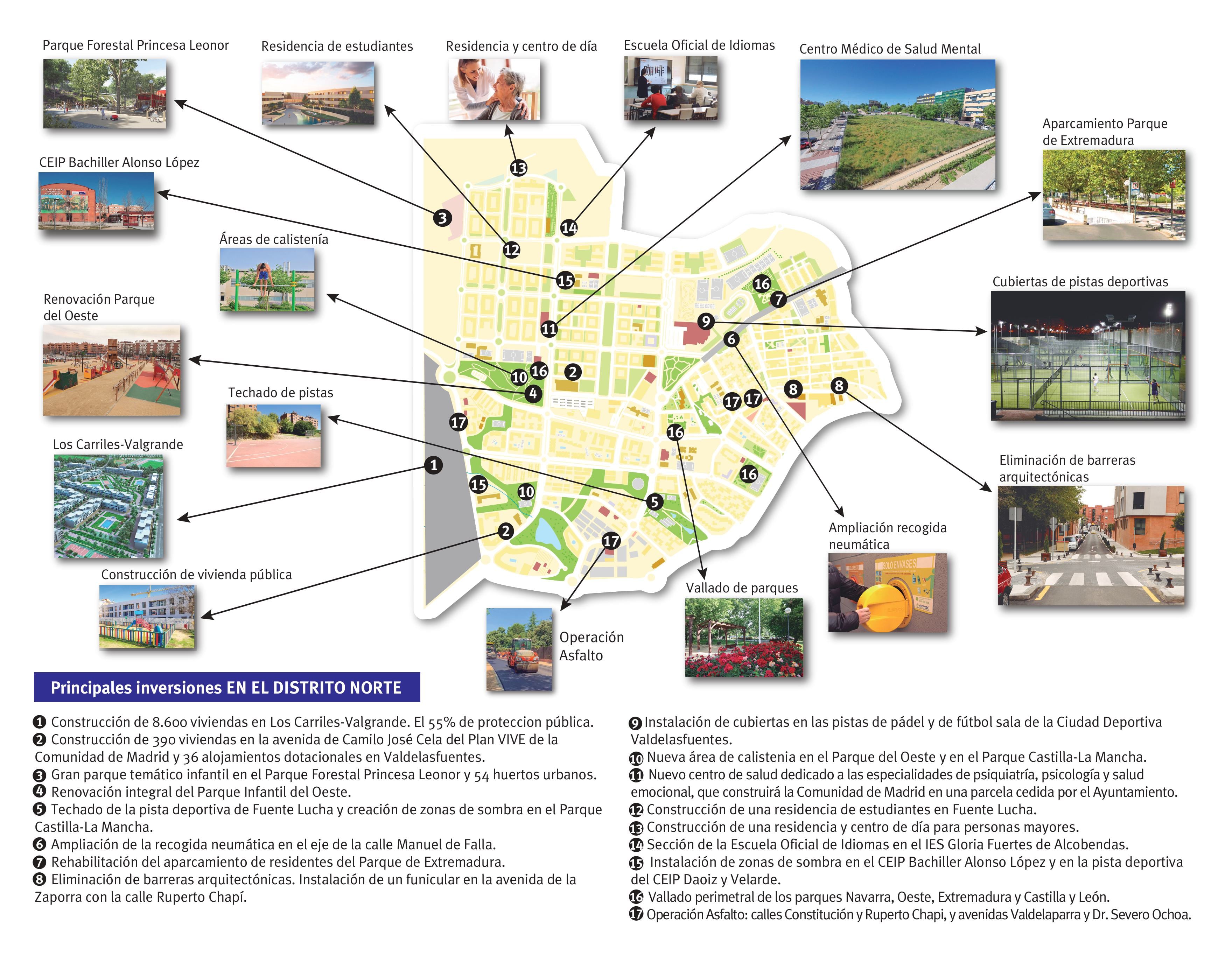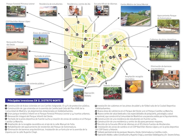 En el Distrito Norte se incluye la construcción de 8.600 viviendas en Los Carriles-Valgrande, 390 viviendas del Plan Vive en la avenida Camilo José Cela y 36 alojamientos dotacionales en Valdelasfuentes. También se recoge el parque infantil y los huertos urbanos que se generarán en el Parque Forestal Princesa Leonor, la creación de zonas de sombra en el Parque Castilla-La Mancha, la ampliación de la recogida neumática de basuras en el eje de la calle Manuel de Falla, la rehabilitación del aparcamiento de residentes del Parque de Extremadura, las nuevas áreas de calistenia en el Parque del Oeste y en el Parque Castilla-La Mancha, el nuevo centro de salud especializado en salud mental, la residencia de estudiantes en Fuente Lucha, la residencia y centro de día para personas mayores, la instalación de zonas de sombra en el CEIP Bachiller Alonso López y en la pista deportiva del CEIP Daoiz y Velarde, el vallado perimetral de los parques Navarra, Oeste, Extremadura, y Castilla y León.