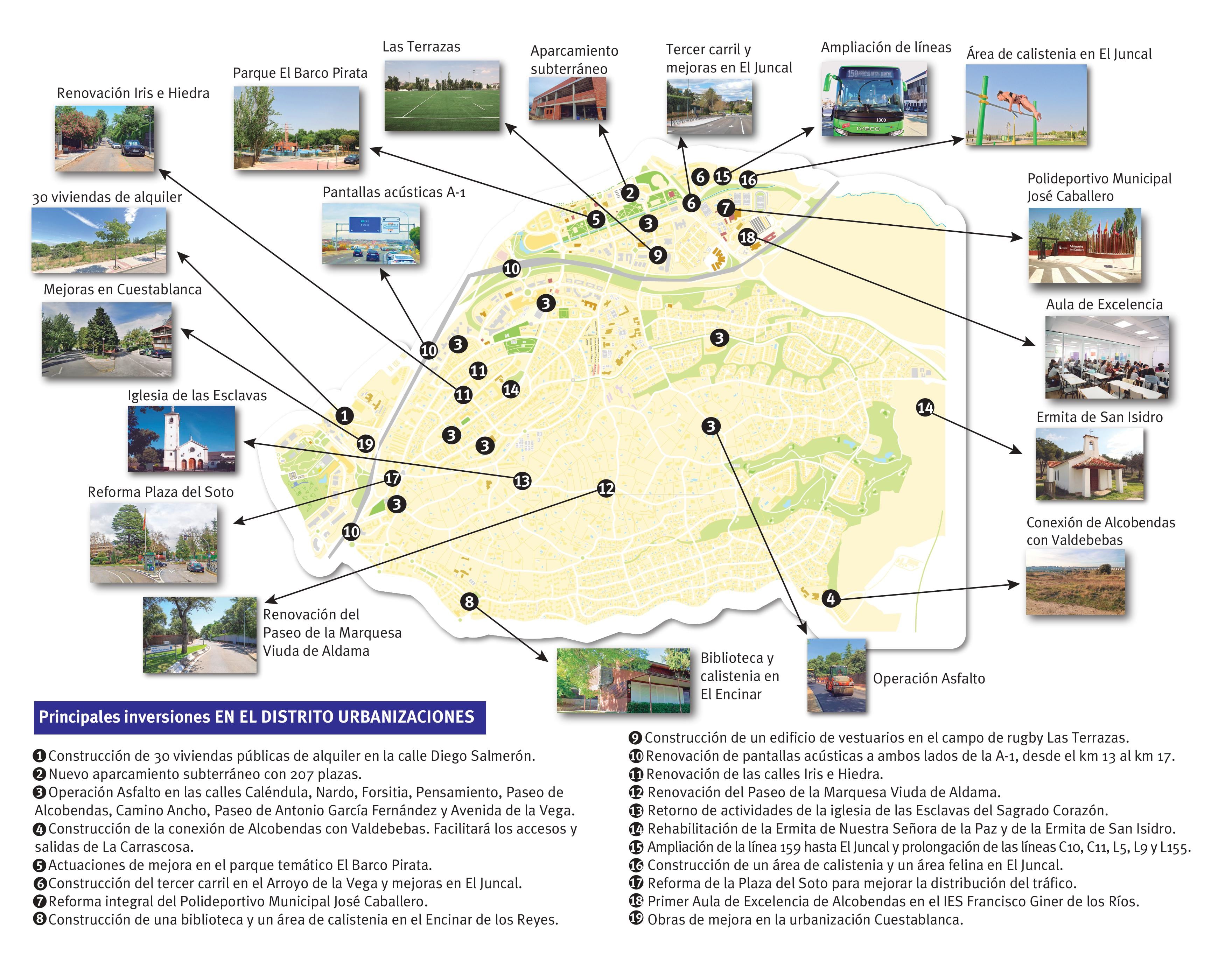 En el Distrito Urbanizaciones se destaca que se construirán 30 viviendas públicas de alquiler en la calle Diego Salmerón, un edificio de vestuarios en el campo de rugby Las Terrazas, la renovación de las calles Iris e Hiedra y del Paseo de la Marquesa Viuda de Aldama, o la construcción de un área de calistenia y un área felina en El Juncal. En este distrito también se recoge la nueva conexión de Alcobendas con Valdebebas en Madrid, que facilitará los accesos y salidas de La Carrascosa, la renovación de las pantallas acústicas a ambos lados de la A-1, la reforma de la Plaza del Soto para mejorar la distribución del tráfico y la construcción de un tercer carril en el Arroyo de la Vega.