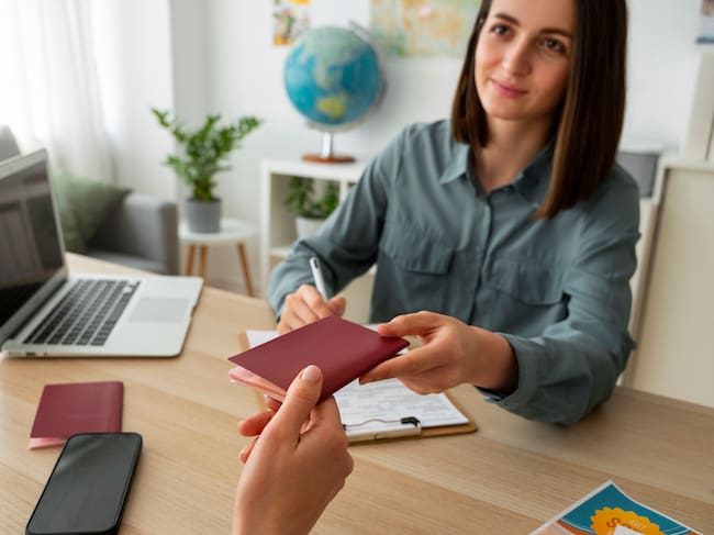 Imagen de una mujer entregando un pasaporte