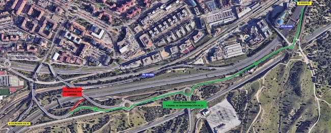 El corte total del ramal de incorporación desde Tres Cantos, situado en el punto kilométrico 24 de la M-607 en sentido Madrid, estará hasta este jueves 19 de febrero, inclusive. Se ha habilitado un itinerario alternativo por el ramal de incorporación en el punto kilométrico 23.