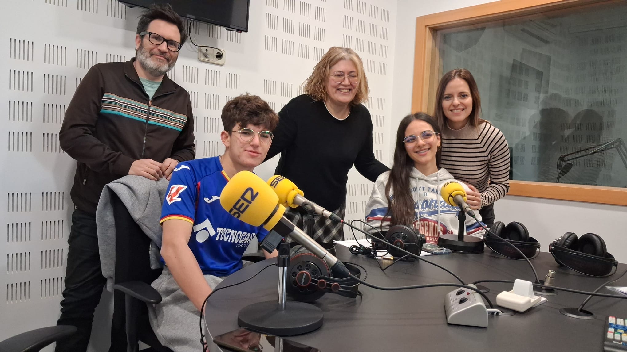 Nacho Martínez, del comité madrileño de UNICEF, Silvia López, coordinadora en el IES Barrio de Loranca, Lucas y Ariadna, alumnos de 1º de Bachillerato, y Beatriz González, educadora de la EI Los Paraísos. / Cadena SER
